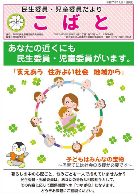 草津市民生委員児童委員協議会では、市民の皆さまに広報啓発をすることで民生委員・児童委員活動をより詳しく知ってもらいたいという思いから、平成27年度より全戸配布で民児協広報紙「こばと」を作成しています。