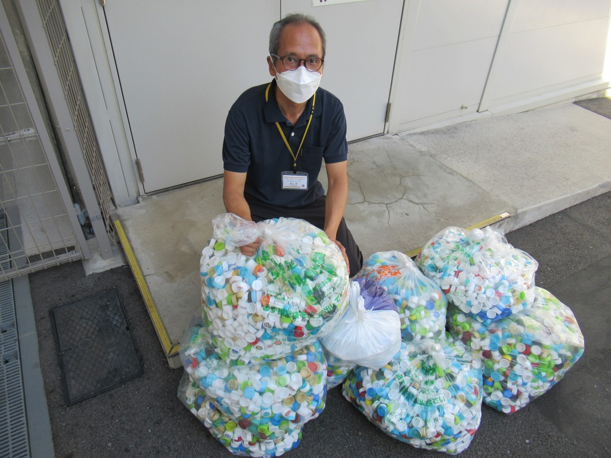 ペットボトルキャップは、作業所での洗浄・分別といった仕事のひとつになっており、障害者の「働きたい」を応援しています。その後、工場でプランターに加工され、再利用されます。