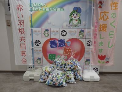 ペットボトルキャップは、作業所での洗浄・分別といった仕事のひとつになっており、障害者の「働きたい」を応援しています。その後、工場でプラスチック製品に加工され、再利用されます。