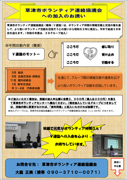 協議会はボランティアグループ仲間の連携により、情報交換・交流の場を通して、より良いボランティア活動を広げると共に、会員相互の資質の向上を目指すことを目的とする。